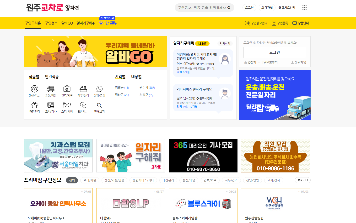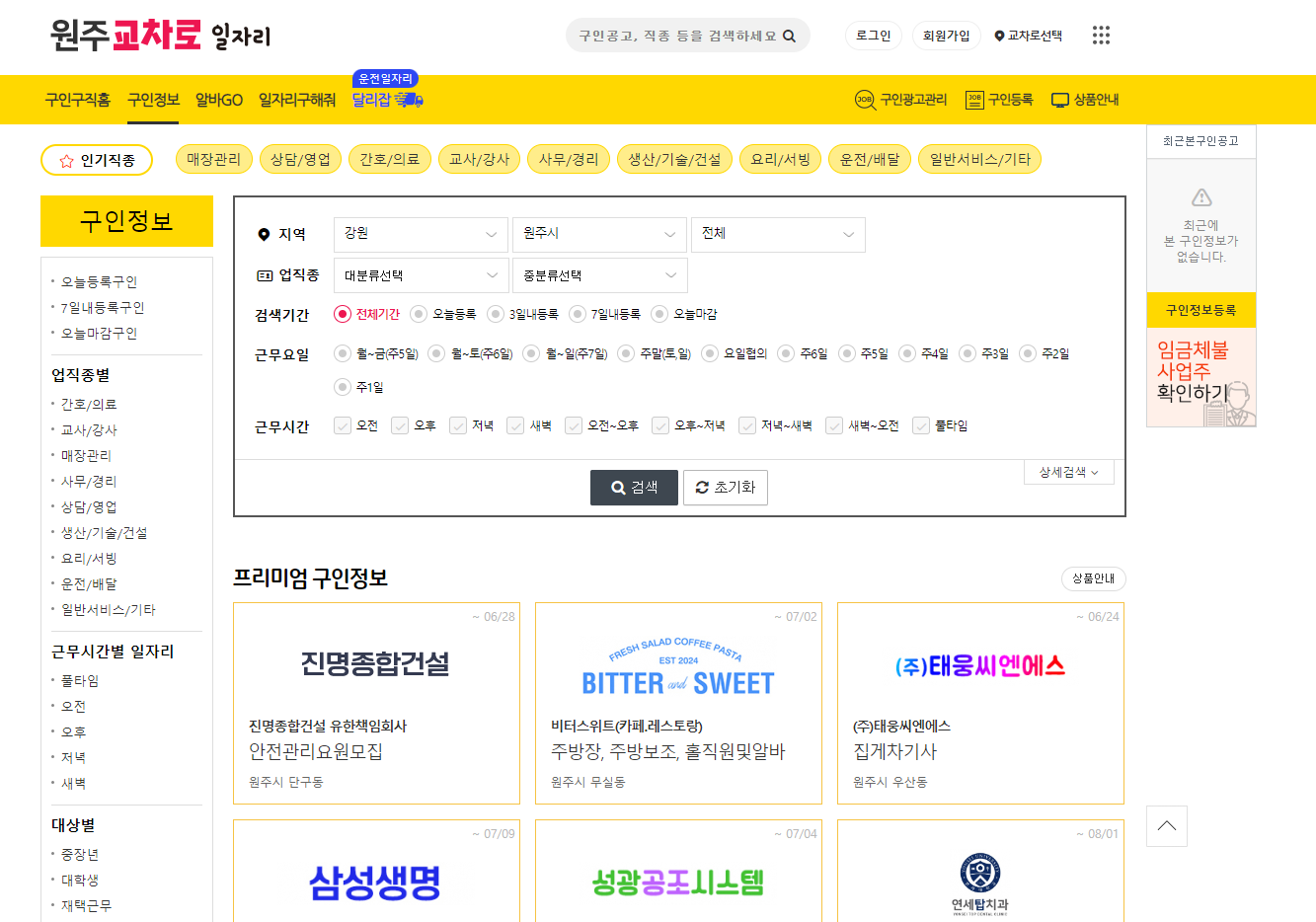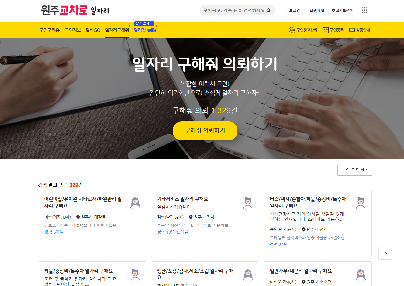 원주 교차로 홈페이지에 접속하면 다양한 분야 및 직종에 따라 일자리 지원이 가능합니다.