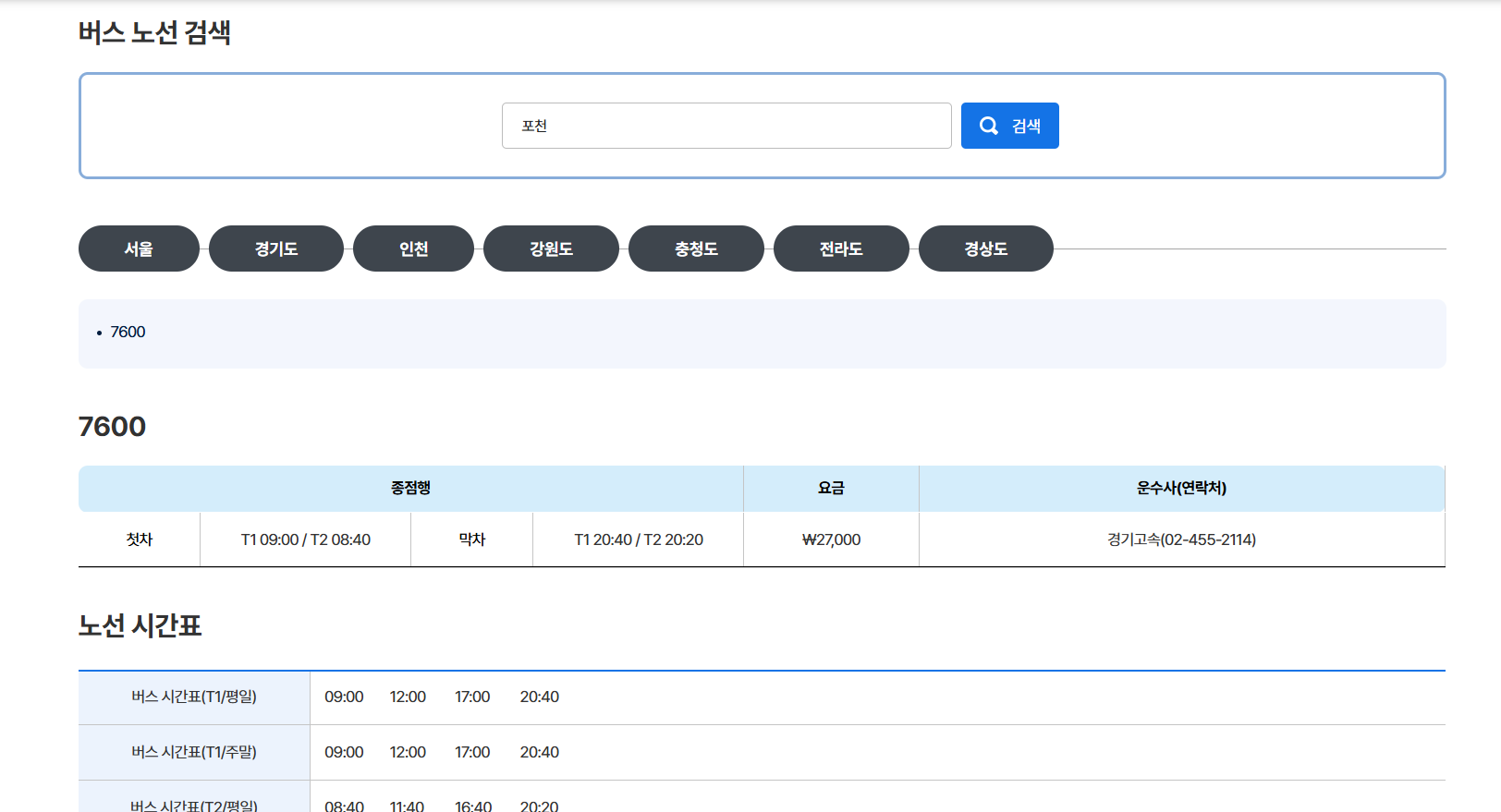 지역에 따라서는 버스가 아예 조회가 안되는 곳도 있지만, 여러 대가 시간표가 다르게 조회되는 경우도 있습니다.