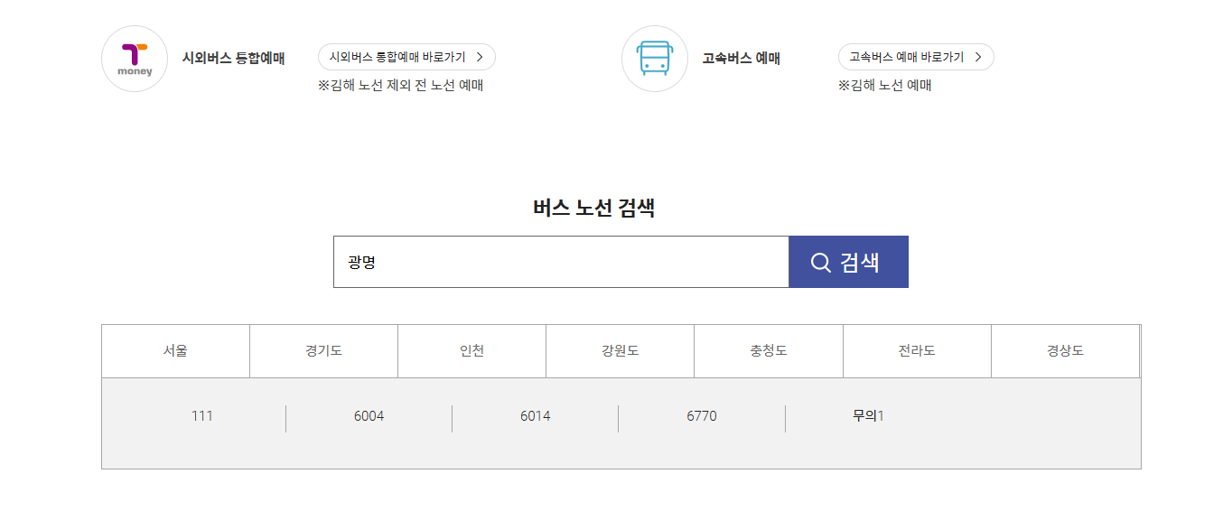 인천공항 홈페이지에서 모든 지역의 버스 노선이 확인 가능하며, 광명 지역까지 가는 경로에 있어서는 여러 버스들이 조회가 되는 상황입니다.