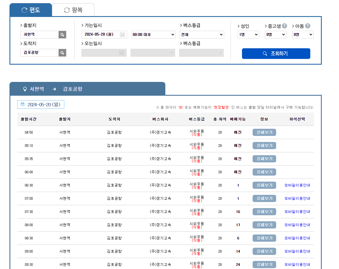위에 안내드린 사이트로 이동해보시면 아래 이미지와 같이 공항버스 시간 및 좌석, 금액, 예매 가능 여부 등을 확인하실 수 있습니다.