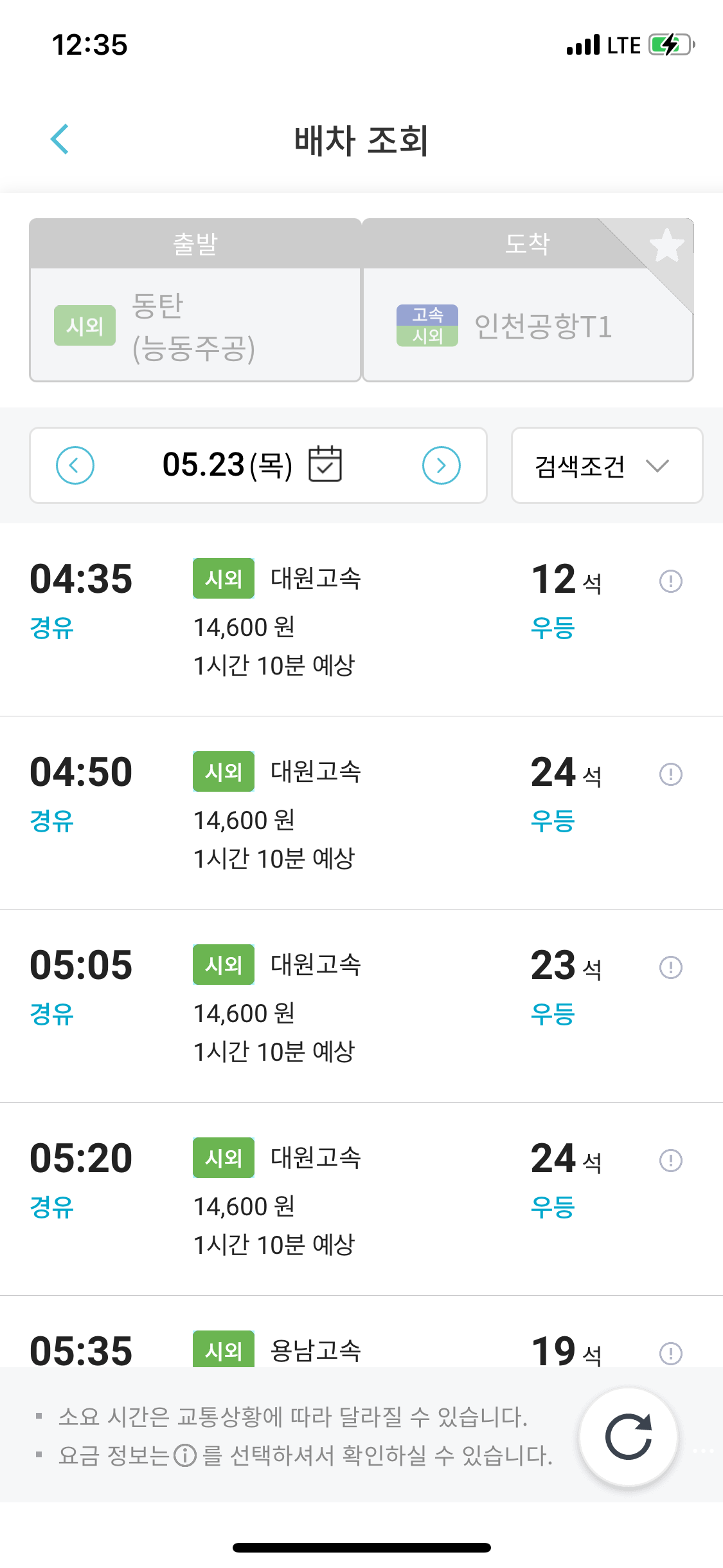 출발지, 도착지를 설정하신 후 원하시는 날짜를 선택하시면 시간대별로 남은 좌석 현황을 확인하실 수 있습니다.