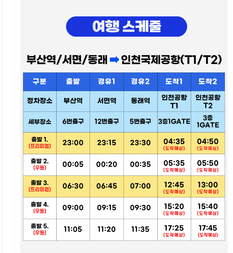 반면 '버스타고' 플랫폼에서는 인천공항까지 가는 루트가 '부산동부', '부산서부', '해운대' 등으로 탑승 지역이 더 많이 나와서 이부분을 참고해보시면 좋겠습니다.