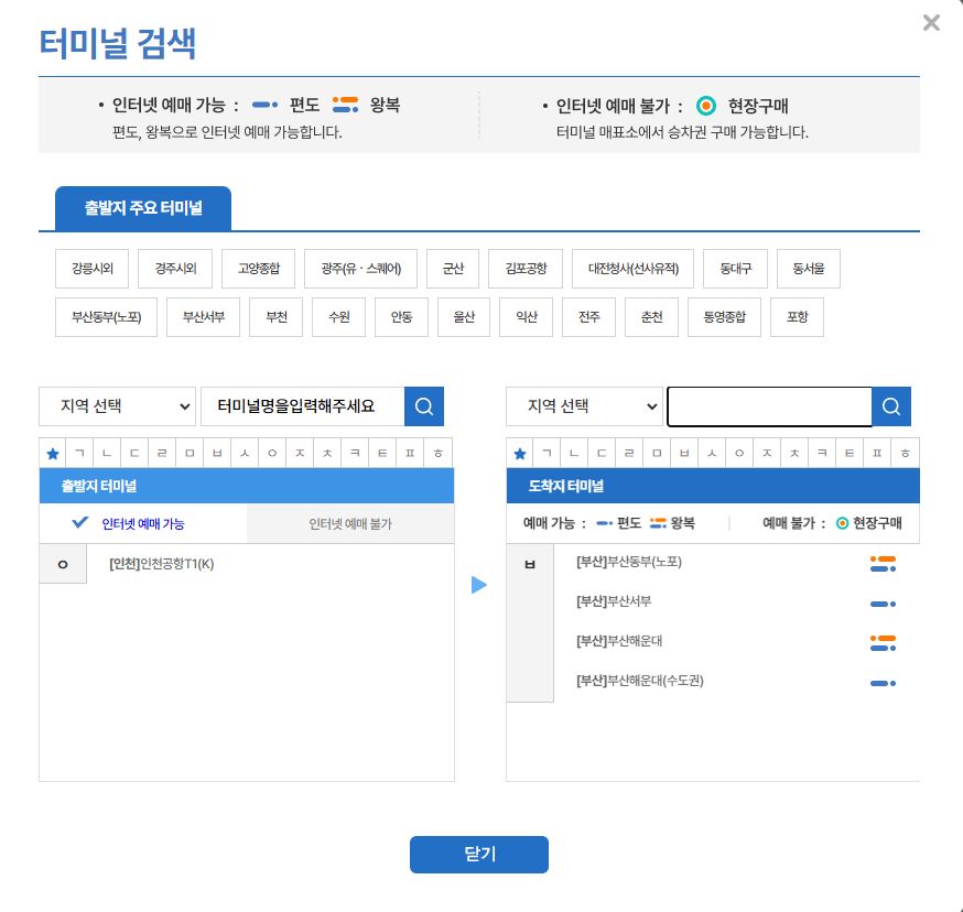 출발지와 도착지 설정을 통해 시간표, 남은 좌석, 금액대, 소요시간 등을 확인할 수 있습니다.