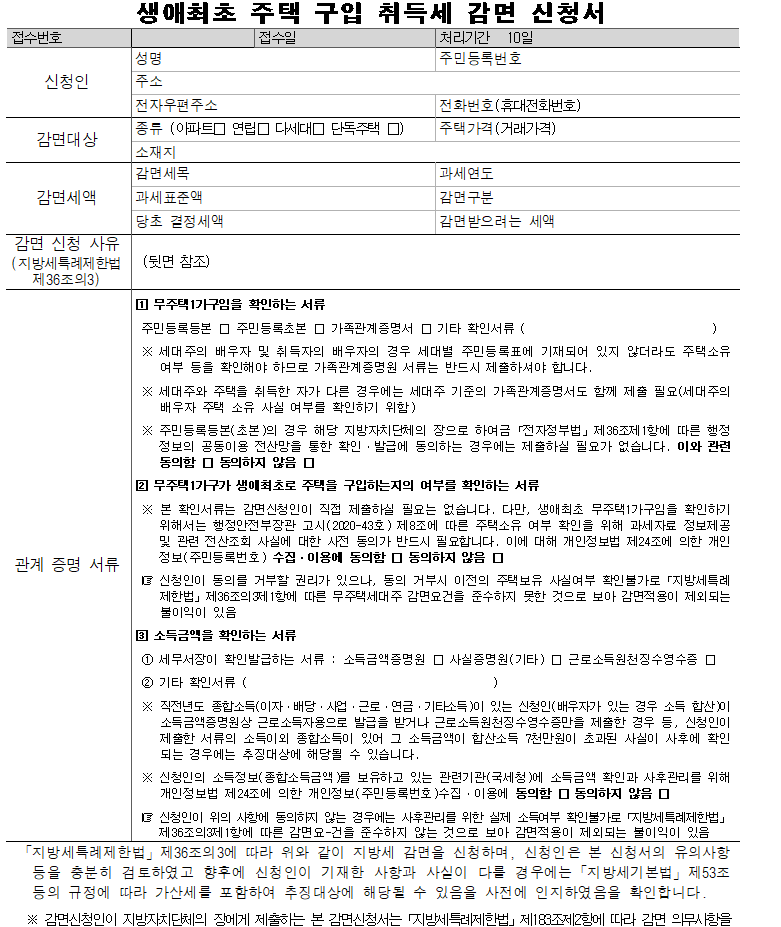 아래 남겨드리는 구비 서류 외에 감면 신청서 및 무주택 요건을 확인할 수 있는 관련 서류를 제출해야 합니다.