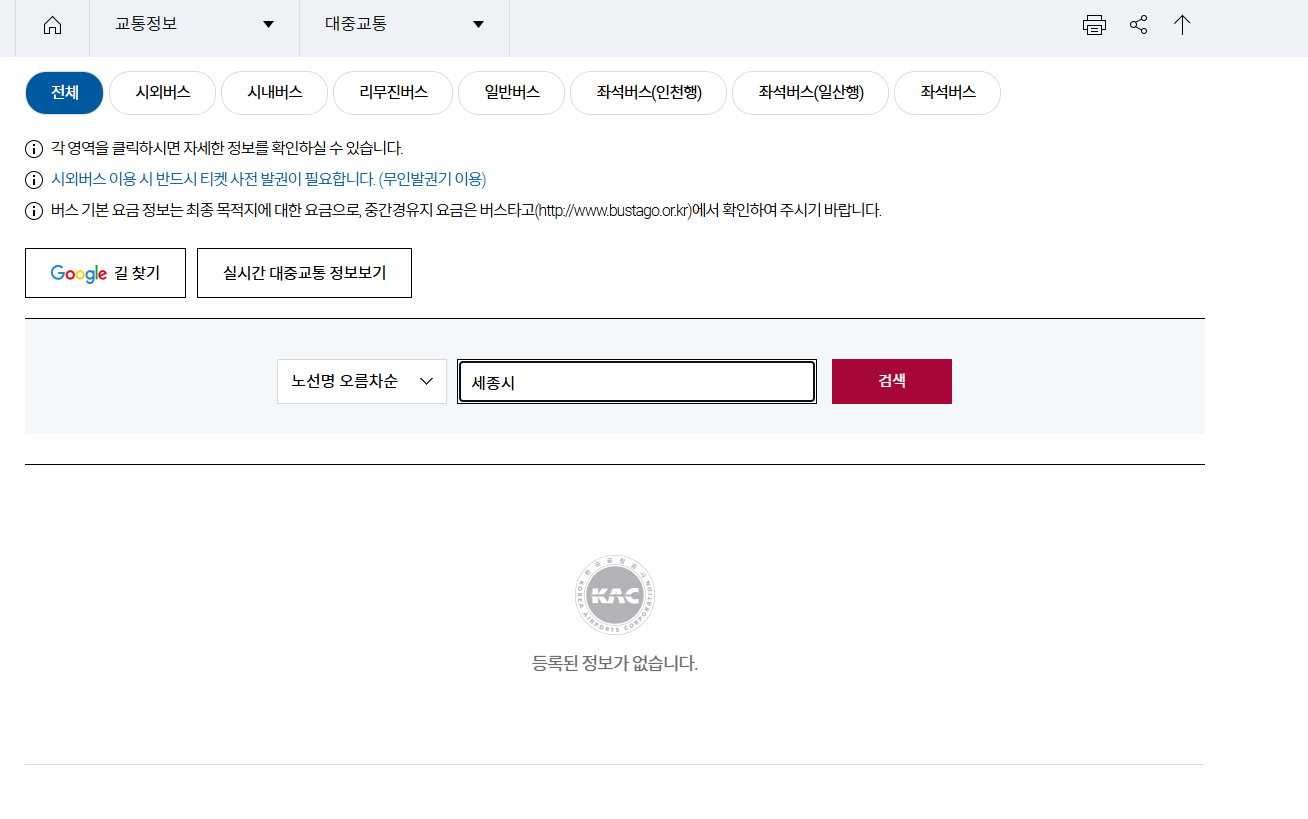 인천공항 > 세종청사 > 세종시 > 유성시외