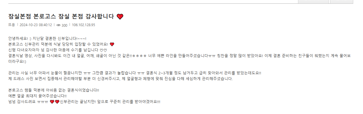 먼저 신부 관리 혹은 혼주피부관리 등으로 경락 효과가 궁금하신 분들은 아래 고객들의 리얼 후기부터 체크해보시는 것을 권장드립니다.