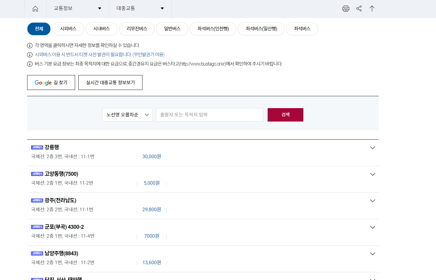전국 팔도에서 인천공항을 경유하는 마을버스, 시내버스, 시외버스 등 모든 버스 노선을 조회해볼 수 있고요.