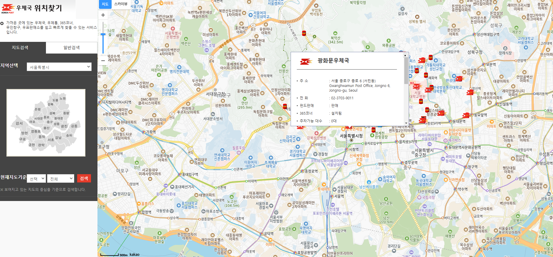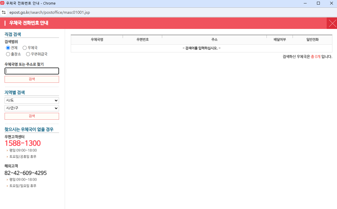 아래 이미지와 같이 '지점 찾기' 메뉴를 통해 원하는 지역의 우체국을 검색하면, 해당 지점의 운영 및 영업 시간과 더불어 전화번호와 주소를 확인할 수 있습니다.
