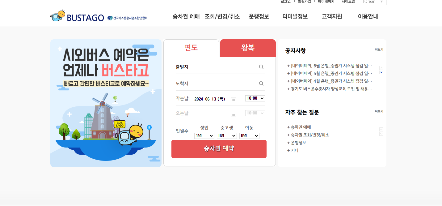 버스타고 홈페이지에 들어가시면 출발지와 도착지 설정을 통해 시간표, 남은 좌석, 금액대, 소요시간 등을 확인할 수 있는데요.