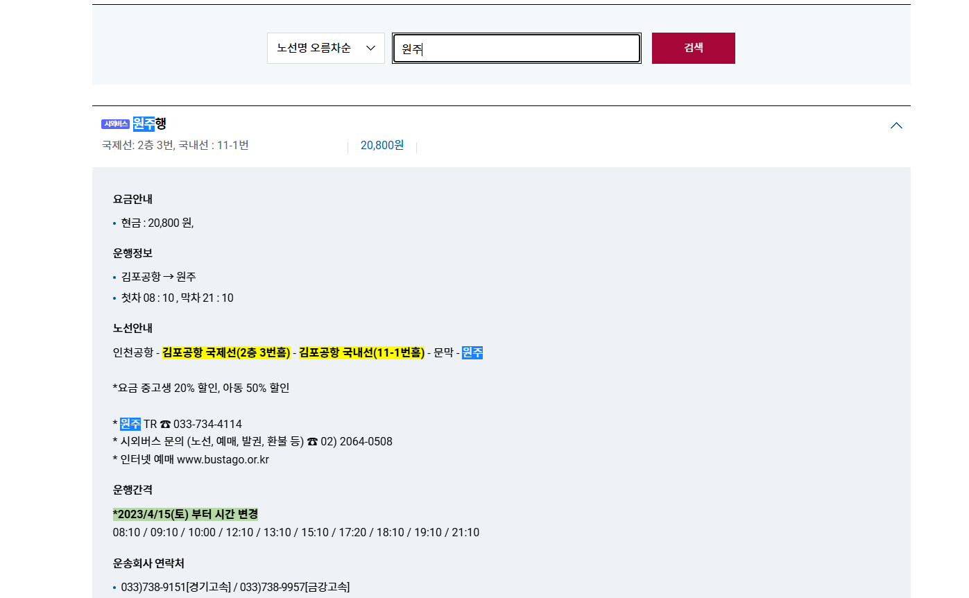- 원주행 버스 노선 : 인천공항 - 김포공항 - 문막 - 원주