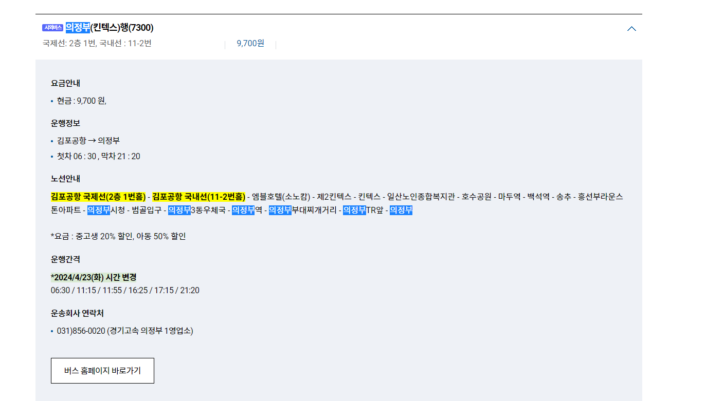 의정부에서 김포공항까지 가는 리무진 버스는 '버스타고' 사이트를 통해 조회가 가능합니다.