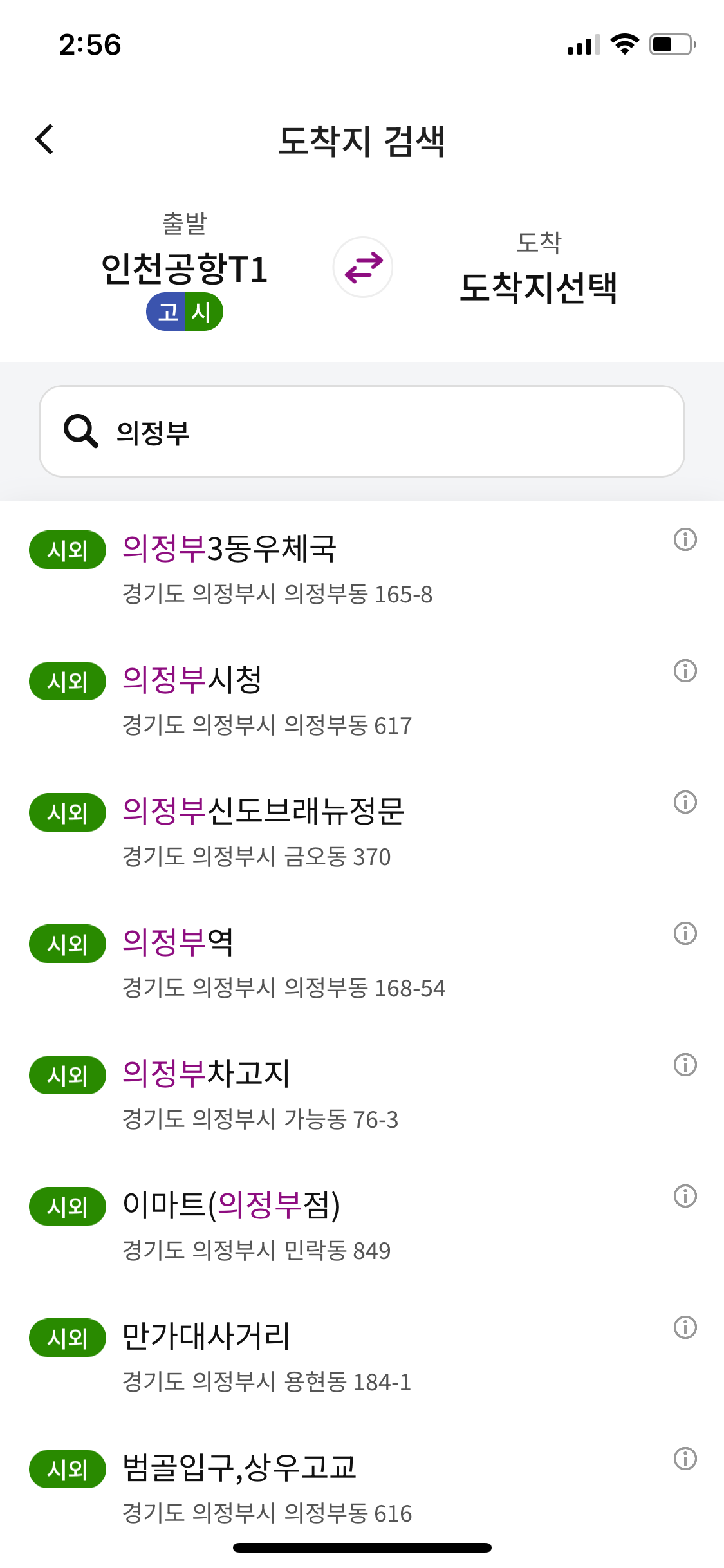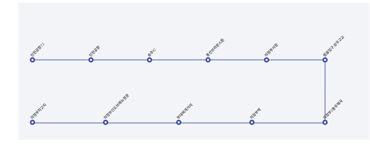 현재 출발지를 인천공항으로 해서 조회를 해보면 의정부에 위치한 다양한 정류소를 확인할 수 있습니다.