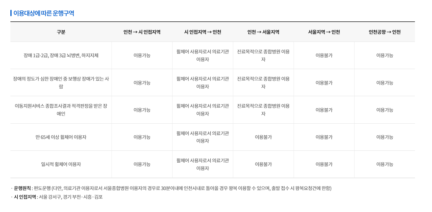 정리해보자면 각 지역마다 이동 가능한 범위가 있고 이용 방법, 준비서류(구비서류), 신청서 작성, 요금 청구 등 운영하는 방식이 다릅니다.