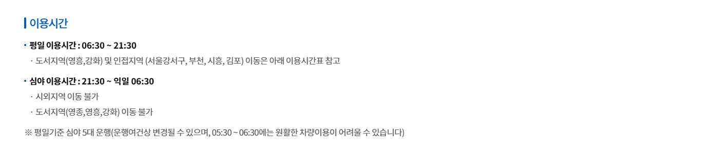 (참고로 의료기관을 이용하는 경우 대기시간 30분 범위 내에서 시내로 돌아올 때 왕복이용이 가능합니다, 이외에는 왕복이 불가능합니다.)
