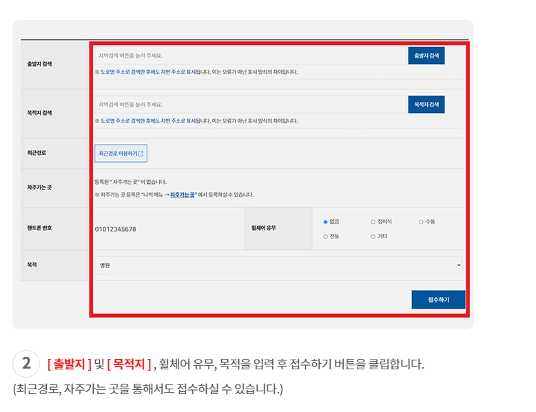 접수는 이용일로부터 최소 1~2일 전에 접수해야 됩니다.