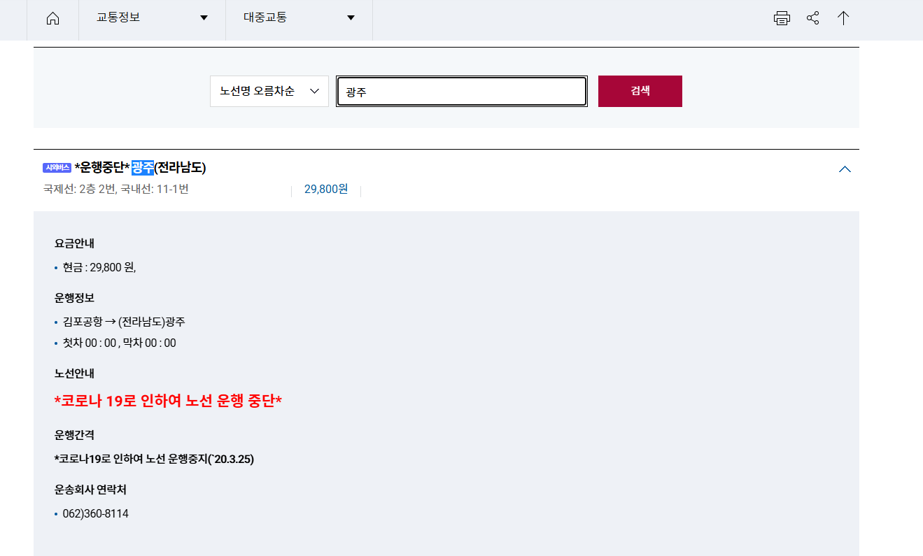 아쉽게도 광주 지역 또한 김포 공항으로 가는 버스는 운행중단으로 조회가 되고 있습니다.