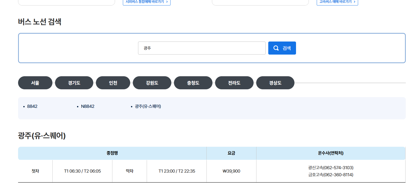 현재 광주로 가는 버스는 대표적으로 유스퀘어 터미널에서 타는 버스만 조회가 되는 상황입니다.