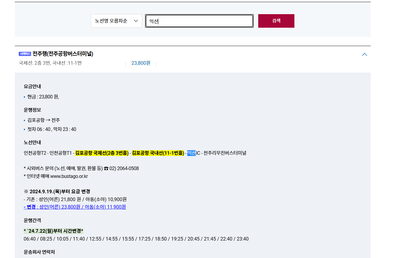 전주같은 경우 다행스럽게도 버스가 있으며, 익산을 경유하는 것을 확인할 수 있습니다.