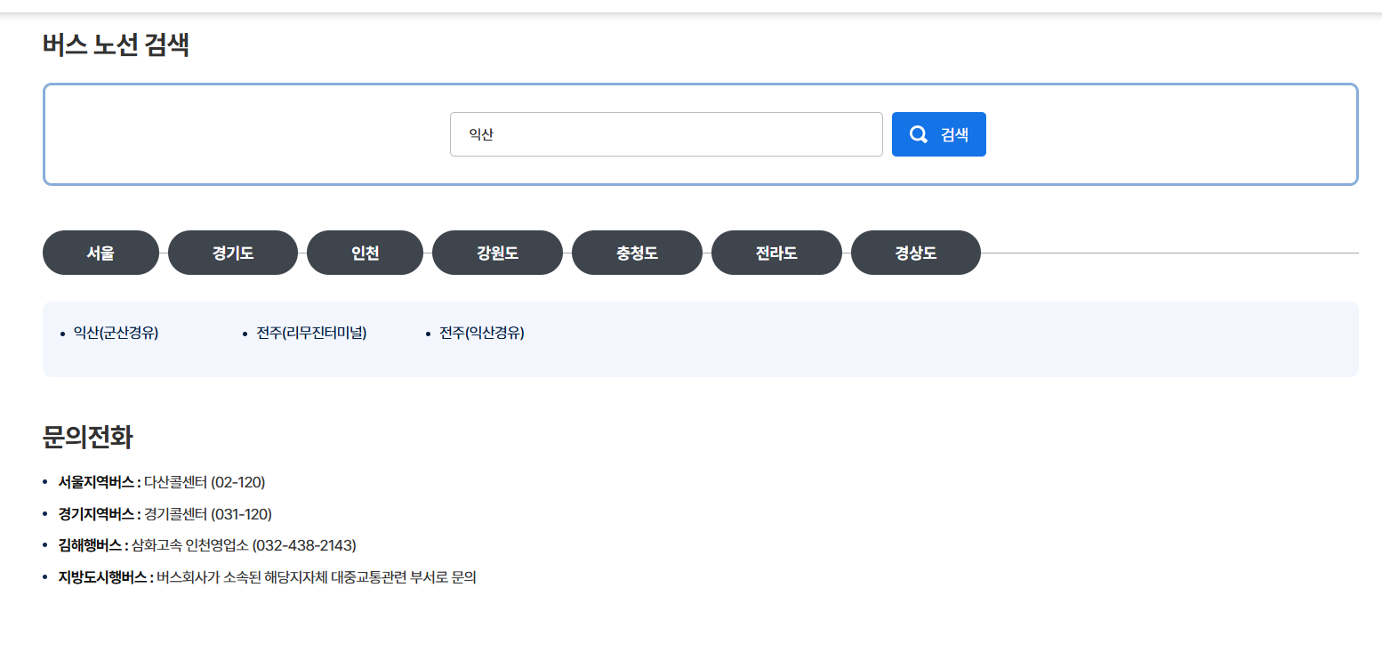 현재 전주로 가는 버스를 조회하면 익산, 군산 등을 경유하는 버스를 확인할 수 있습니다.