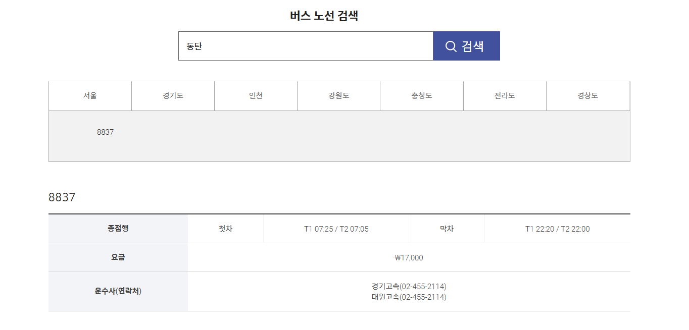 그에 반면 동탄 지역은 직통으로 가는 버스가 하나로 조회가 되는 상황입니다.