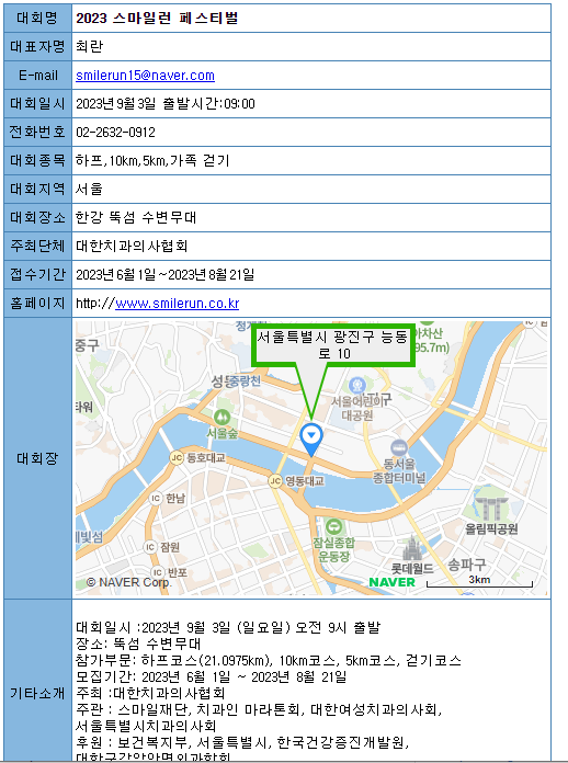 그 후에는 대회 링크를 눌렀을 때 나오는 정보를 통해 대회명, 일시, 시간, 주최단체, 접수시간, 참가비 등을 확인할 수 있습니다.