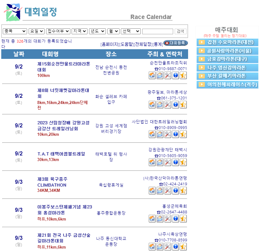 현재 9월 기준으로 대략 300개가 넘는 마라톤 대회가 등록되어 있습니다.
