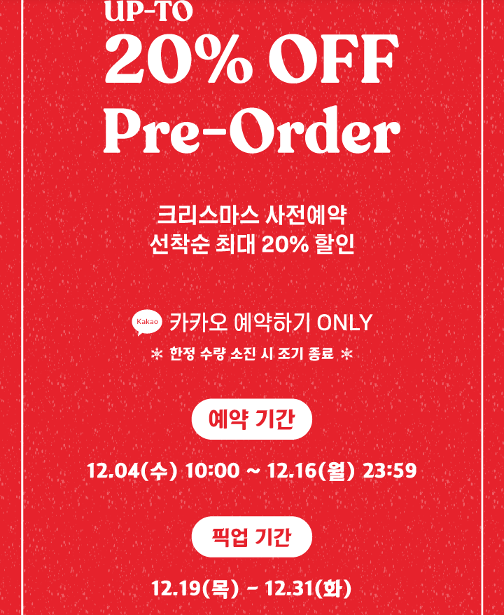 사전 예약을 통해서는 20%까지 할인을 받을 수 있지만, 일부 인기 있는 케이크는 예약 기간이 끝나기 전에 모두 판매될 수 있으니 미리 주문을 해두시면 좋겠습니다.