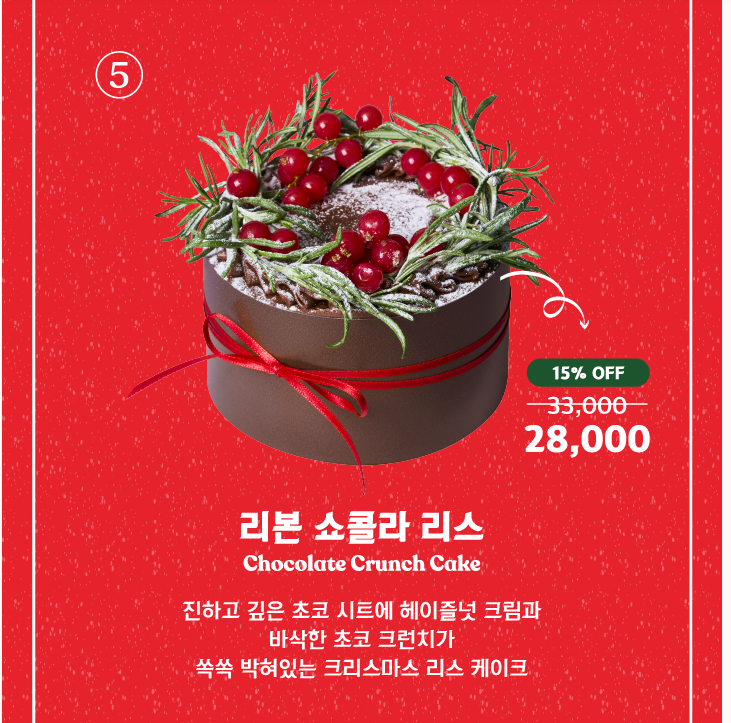 4. 리본 쇼콜라 리스 - 진하고 깊은 초코 헤이즐넛 맛을 느낄 수 있으며, 바삭한 크런치가 담긴 초코 케익