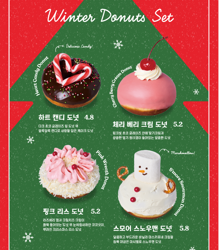 크리스마스 도넛 4종 세트와 더불어 케이크, 디저트 등은 시즌 전용 상자 및 쇼핑백에 담아준다고 합니다.
