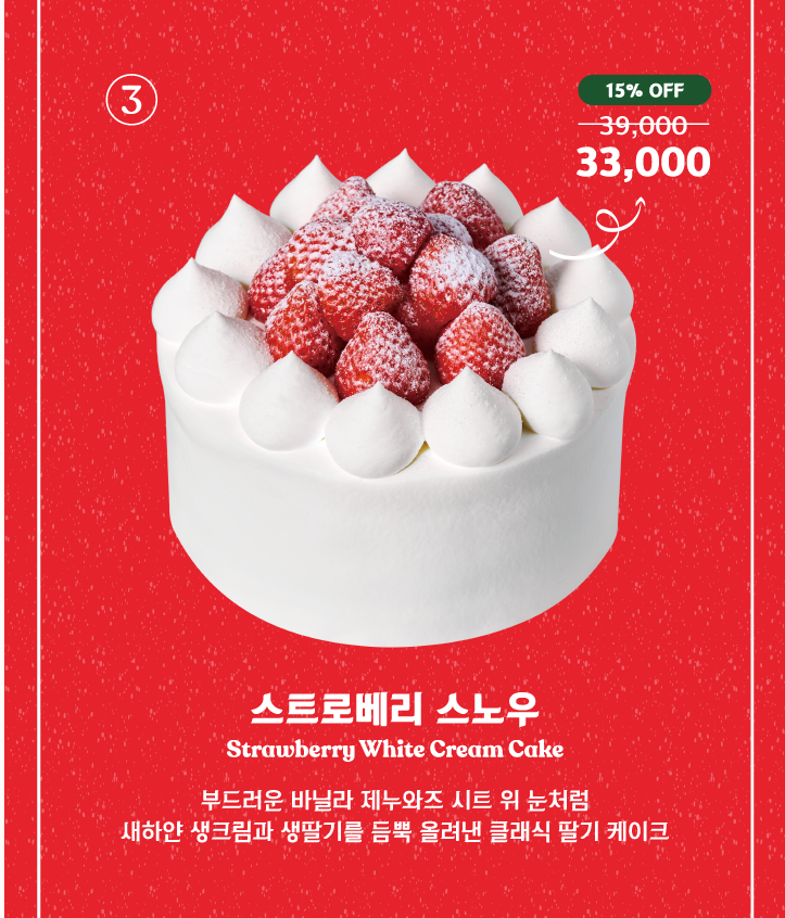 3. 스트로베리 스노우 - 부드러운 바닐라 시트 위 생크림과 생딸기가 가득 올라간 클래식 딸기 케익