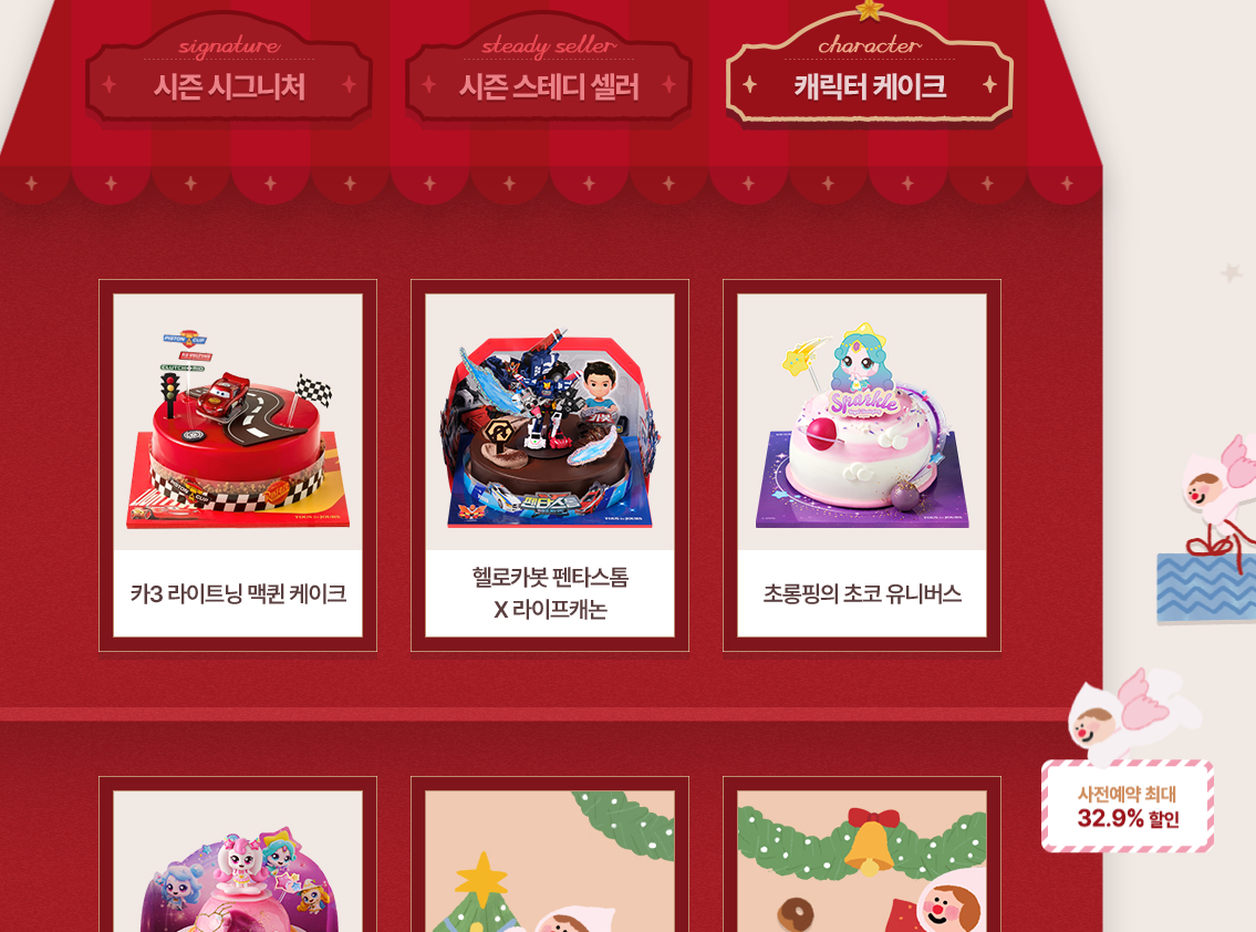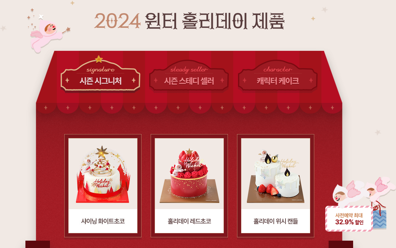 시즌 시그니처부터, 시즌 스테디셀러, 캐릭터 케익 등 다양한 종류로 나뉘어져 있고 대표적인 케이크 종류는 다음과 같습니다.
