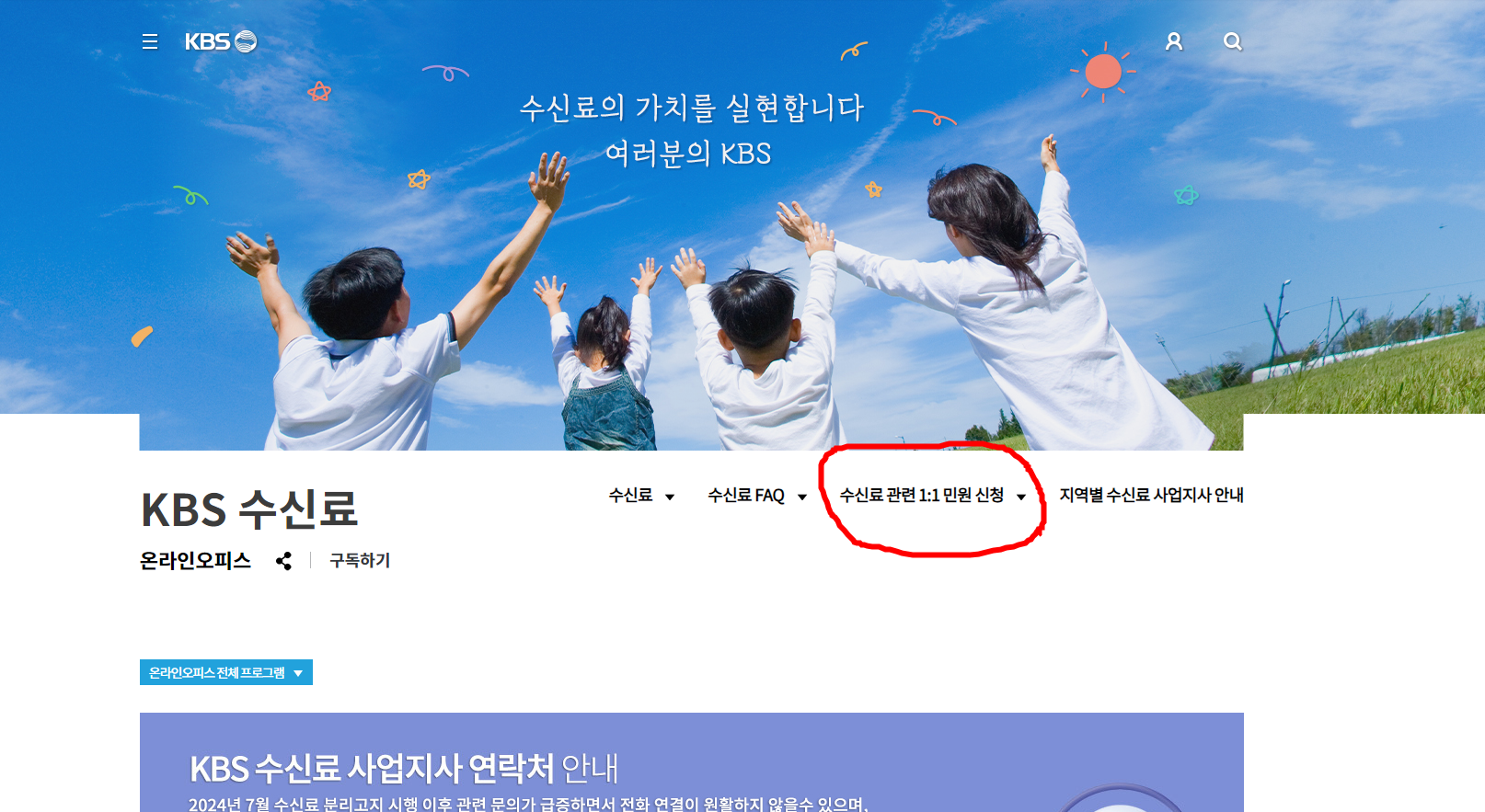 2. 수신료 관련 1:1 민원 신청 메뉴 탭을 누릅니다.